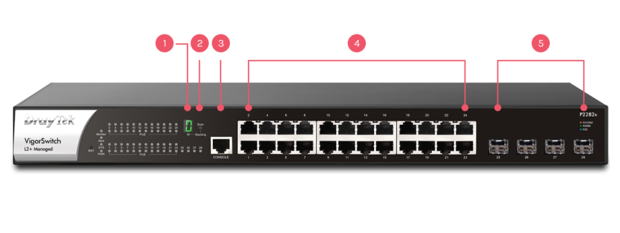 De VigorSwitch G2282x is een geavanceerde layer 2+ managed switch met vier 10 Gigabit uplink poorten en 24 Gigabit poorten. Deze uplink poorten zijn ideaal voor netwerkverbindingen tussen switches, servers en opslagapparatuur en zorgen voor een efficiënte en snelle dataoverdracht.